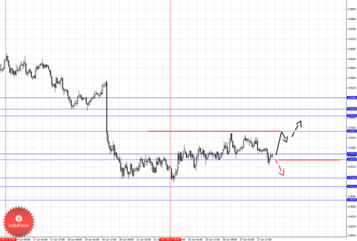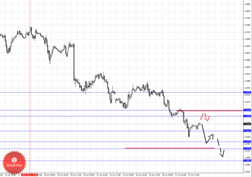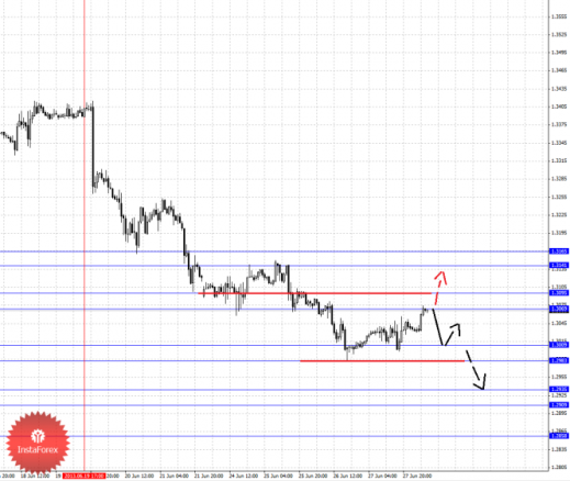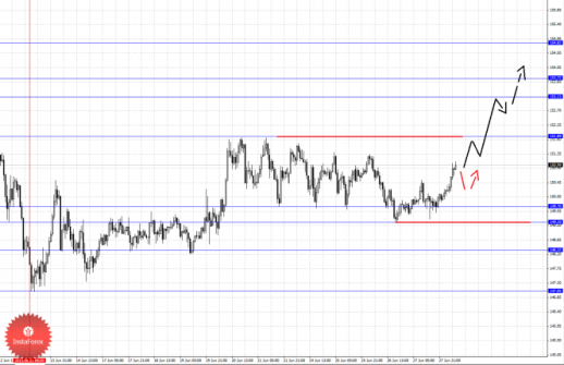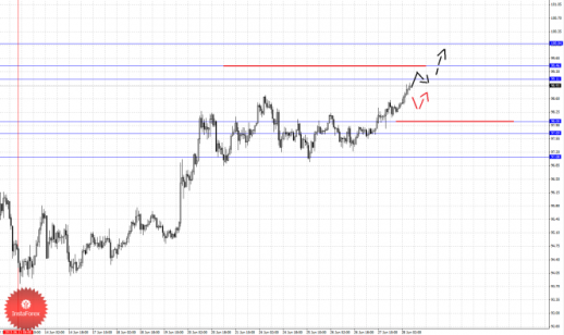 По паре Евро/Доллар продолжаем следить за нисходящей структурой от 19 июня. По паре Доллар/Франк следим за восходящей структурой от 13 июня. По паре Фунт/Доллар цена пока находится в корректировочной зоне от нисходящей структуры 17 июня. По паре Доллар/Иена продолжения движения кверху ожидаем после пробоя 99.11. По паре Евро/Иена от 26 июня формируется локальная структура для продолжения восходящей тенденции. По паре Фунт/Иена ключевые цели пока остаются без изменения.