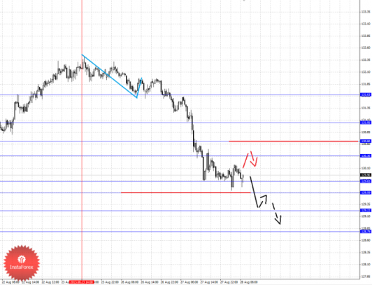 По паре Евро/Иена ключевыми уровнями являются: 131.63, 131.05, 130.66, 130.36, 129.83, 129.59, 129.22 и 128.79. Здесь мы перешли в масштаб М30 для наиболее наглядного различения нисходящего цикла от 23 августа. Краткосрочное нисходящее движение ожидаем в диапазоне 129.83–129.59, пробой последнего значения должен сопровождаться выраженным нисходящим движением, в данном случае цель 129.22. Потенциальным значением для низа считаем уровень 128.80, по достижении которого ожидаем консолидацию. Краткосрочное восходящее движение возможно в коридоре 130.36–130.66, пробой последнего значения будет располагать к развитию восходящего движения, здесь цель 131.05. Уровень 131.63 пока интересен с точки зрения среднесрочной перспективы.
