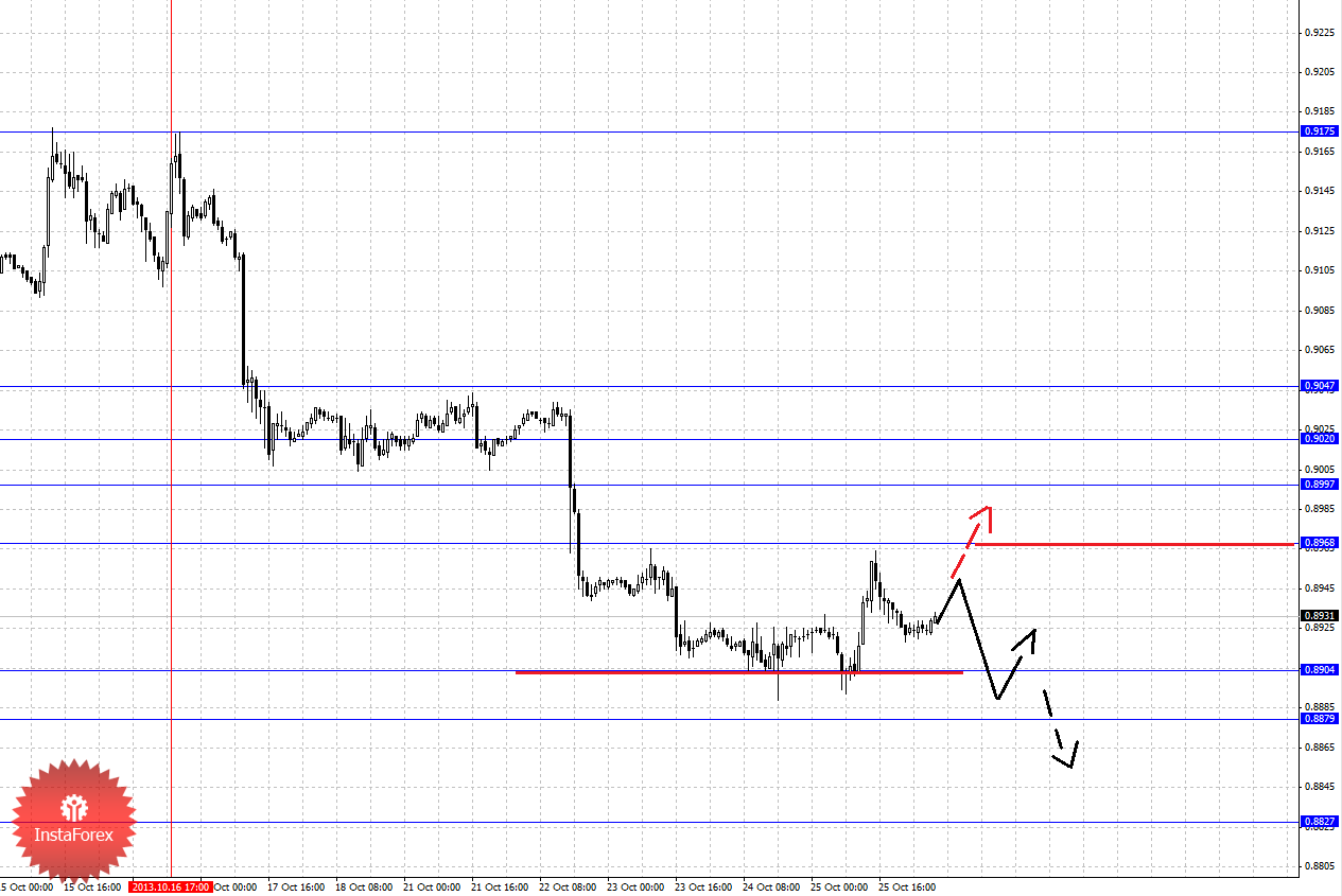 По паре Доллар/Франк ключевым уровня являются: 0.9047, 0.9020, 0.8997, 0.8968, 0.8938, 0.8904, 0.8879 и 0.8827. Здесь продолжения движения книзу от 16 октября ожидаем после пробоя 0.8938, в данном случае цель 0.8904, в коридоре 0.8904 – 0.8879 консолидация цены. Потенциальным значением для низа считаем уровень 0.8827, движение к которому ожидаем после пробоя 0.8876. Краткосрочное восходящее движение возможно после пробоя 0.8968, здесь цель – 0.8997, из коридора 0.8997 – 0.9020 высока вероятность разворота книзу, пробой уровня 0.9020 будет располагать к формированию восходящей структуры, в данном случае потенциальная цель – 0.9047.