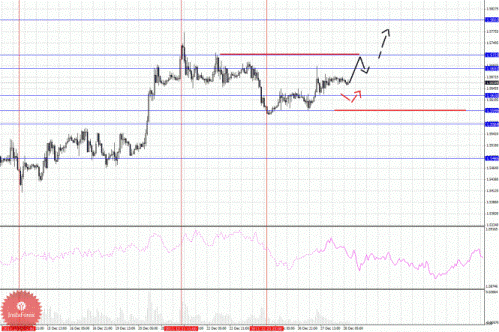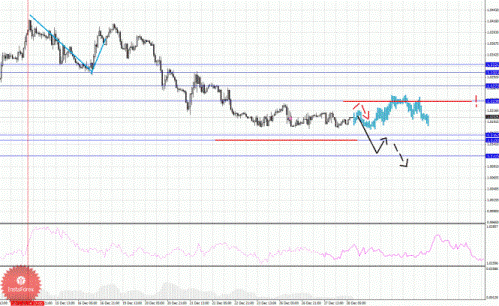 По паре Евро/Доллар мы наблюдаем застой цены в горизонтальном коридоре, и здесь необходимо помнить правило, что чем дальше цена от начальных условий, тем слабее последующая связь при развитии тенденции. По паре Доллар/Франк аналогичная картина происходит с восходящей структурой от 21 декабря. По паре Фунт/Доллар восходящее движение от 23 декабря пока укрепило свои позиции, в целом, развитие восходящей тенденции в масштабе Н1 ожидаем после пробоя 1.5723. По паре Доллар/Йена без изменений. По паре Евро/Йена продолжаем следить за восходящей структурой от 15 декабря, также необходимо обратить внимание на ключевую поддержку для верха 101.25. По паре Фунт/Йена цена находится в корректировочной зоне от восходящей структуры 14 декабря.