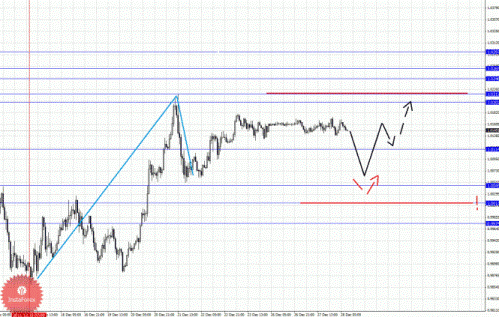 По паре Доллар/Франк ключевым уровня являются: 0.9549, 0.9504, 0.9480, 0.9428, 0.9389, 0.9317, 0.9289, 0.9260, 0.9211 и 0.9172. Здесь мы наблюдаем формирование восходящего потенциала от 21 декабря, что в свою очередь может изменить ситуацию по паре Евро/Доллар. Краткосрочное движение кверху ожидаем в диапазоне 0.9389 – 0.9428, пробой последнего значения должен сопровождаться импульсивным движением к уровню 0.9480, в коридоре 0.9480 – 0.9504 консолидация цены. Потенциальным значением для верха считаем уровень 0.9549, по достижении которого ожидаем откат книзу. Корректировочное нисходящее движение возможно в коридоре 0.9317 – 0.9289, пробой последнего значения окажет негативное влияние на развитие восходящей структуры от 21 декабря, здесь цель 0.9260, пробой которого, в свою очередь, продолжит нисходящее движение от 15 декабря, в данном случае первая цель 0.9211.