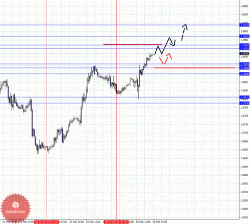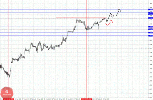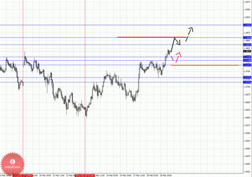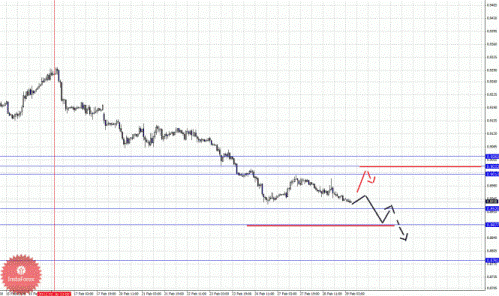 По паре Евро/Доллар цена отменила формирование потенциала для нисходящего движения, и здесь мы следим за локальной структурой от 27 февраля. По паре Доллар/Франк продолжения движения к низу ожидаем после пробоя 0.8920. По паре Фунт/Доллар от 27 февраля сформировалась локальная структура для продолжения восходящей тенденции. По паре Доллар/Йена ситуация пока остается без изменения. По паре Евро/Йена продолжаем следить за нисходящей структурой от 24 февраля. По паре Фунт/Йена отмены нисходящей структуры от 27 февраля ожидаем после пробоя 128.85.