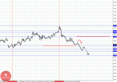 По паре Доллар/Канадский доллар ключевыми уровнями являются: 1.0049, 1.0017, 1.0006, 0.9982, 0.9925, 0.9905, 0.9891 и 0.9865. Здесь цена близка к отмене восходящей структуры от 20 февраля. Продолжения движения книзу ожидаем после пробоя 0.9925, в данном случае цель 0.9905, в коридоре 0.9905 – 0.9891 консолидация цены. Потенциальным значением для низа считаем уровень 0.9865, по достижении которого,ожидаем откат кверху. Уровень 0.9982 является ключевой поддержкой для нисходящей структуры, его пробой будет располагать к развитию верха, в данном случае первая цель 1.0006. Диапазон 1.0006 – 1.0017 шумовой, проход его ценой начнет развитие восходящей тенденции в масштабе Н1, здесь потенциальная цель – 1.0049.