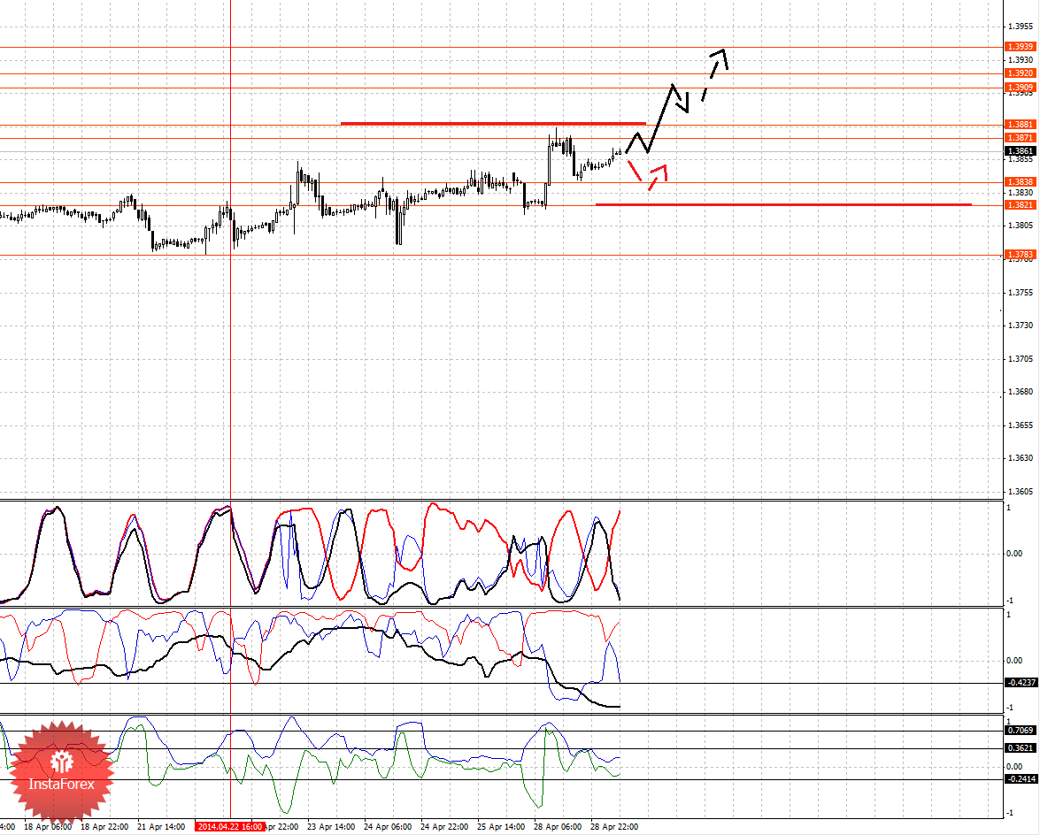 По паре Евро/Доллар ключевыми уровнями в масштабе Н1 являются: 1.3939, 1.3920, 1.3909, 1.3881, 1.3871, 1.3838, 1.3821 и 1.3783. Здесь продолжения развития восходящей структуры от 22 апреля ожидаем после прохода ценой шумового диапазона 1.3871 – 1.3881, в данном случае цель – 1.3909, в коридоре 1.3909 – 1.3920 консолидация цены. Потенциальным значением для верха считаем уровень 1.3939, по достижении которого ожидаем откат книзу. Краткосрочное нисходящее движение возможно в коридоре 1.3838 – 1.3821, отсюда высока вероятность разворота кверху, пробой уровня 1.3820 будет располагать к развитию нисходящей структуры, здесь цель – 1.3783.