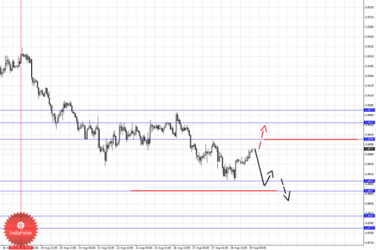 По паре Австралийский доллар/Доллар ключевыми уровнями являются: 0.9073, 0.9042, 0.8999, 0.8892, 0.8867, 0.8804 и 0.8772. Здесь мы продолжаем следить за развитием нисходящего цикла от 19 августа. Краткосрочное нисходящее движение ожидаем в диапазоне 0.8892–0.8867, пробой последнего значения приведет к развитию импульса, в данном случае цель 0.8804. Потенциальным значением для низа считаем уровень 0.8772, по достижении которого ожидаем консолидированное движение. Уровень 0.8999 является ключевой поддержкой для нисходящей тенденции, его пробой будет располагать к развитию восходящего движения, в данном случае потенциальная цель – 0.9042. Диапазон 0.9073–0.9042 шумовой.