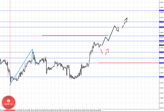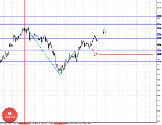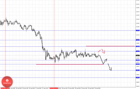 По паре Евро/Доллар мы следим за развитием нисходящего цикла от 20 августа. По паре Доллар/Франк вернулись к рассмотрению восходящей структуры от 20 августа в качестве опорной точки. По паре Фунт/Доллар продолжения движения книзу ожидаем после пробоя 1.5465. По паре Доллар/Иена развитие восходящей структуры от 28 августа ожидаем после пробоя 98.74. По паре Евро/Иена цена близка к тому, чтобы продолжить развитие нисходящей тенденции от 23 августа. По паре Фунт/Иена продолжения движения кверху ожидаем только после пробоя 152.94.
