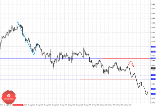 По паре Австралийский доллар/Доллар ключевыми уровнями являются: 0.9073, 0.9042, 0.8999, 0.8892, 0.8867, 0.8804 и 0.8772. Здесь мы продолжаем следить за развитием нисходящего цикла от 19 августа. Краткосрочное нисходящее движение ожидаем в диапазоне 0.8892–0.8867, пробой последнего значения приведет к развитию импульса, в данном случае цель 0.8804. Потенциальным значением для низа считаем уровень 0.8772, по достижении которого ожидаем консолидированное движение. Уровень 0.8999 является ключевой поддержкой для нисходящей тенденции, его пробой будет располагать к развитию восходящего движения, в данном случае потенциальная цель – 0.9042. Диапазон 0.9073 – 0.9042 шумовой.