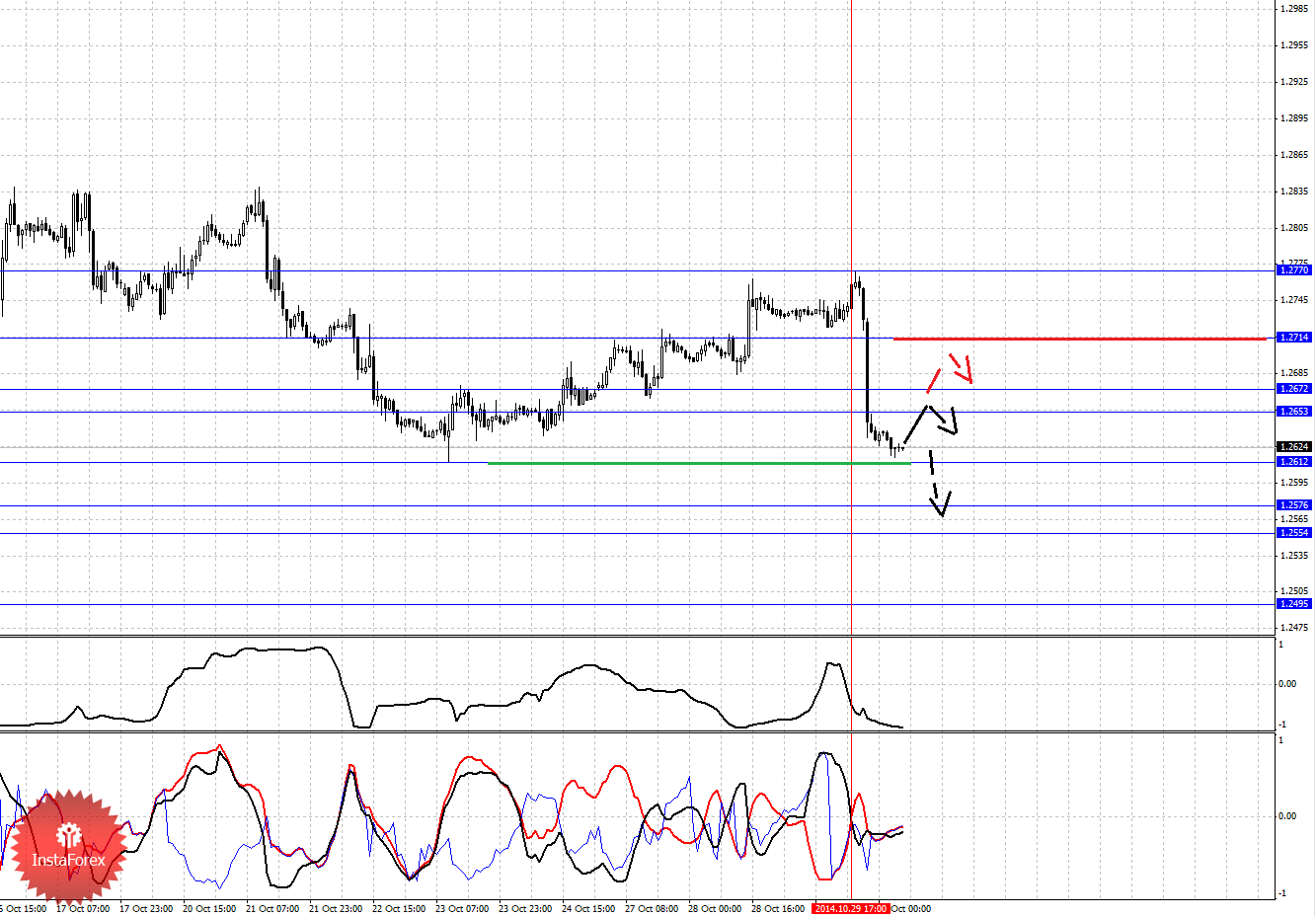 По паре Евро/Доллар ключевыми уровнями в масштабе Н1 являются: 1.2770, 1.2714, 1.2672, 1.2653, 1.2612, 1.2576, 1.2554 и 1.2495. Здесь мы следим за формированием нисходящего потенциала от 29 октября. Продолжения движения книзу и оформления выраженных начальных условий, ожидаем после пробоя 1.2612, в данном случае цель – 1.2576, возле этого уровня консолидация цены. Проход ценой шумового коридора 1.2576 – 1.2554 должен сопровождаться развитием выраженного движения, здесь потенциальная цель – 1.2495. Краткосрочное восходящее движение, возможно в коридоре 1.2653 – 1.2672, пробой последнего значения приведет к углубленному движению, здесь цель – 1.2714, этот уровень является ключевым сопротивлением для развития восходящей структуры, в данном случае потенциальная цель для верха – 1.2770.