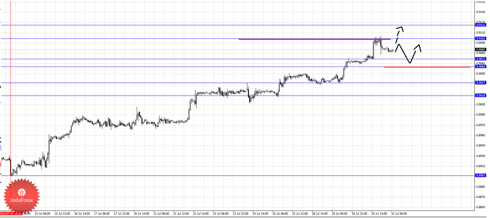 По паре Доллар/Франк ключевыми уровнями в масштабе Н1 являются: 0.9121, 0.9101, 0.9071, 0.9060, 0.9037 и 0.9018. Здесь продолжения движения кверху ожидаем после пробоя 0.9101, в данном случае потенциальная цель – 0.9121, по достижении этого уровня ожидаем откат книзу. Краткосрочное нисходящее движение, возможно в коридоре 0.9071 – 0.9060, пробой последнего значения приведет к развитию нисходящей коррекции, здесь цель – 0.9037. Потенциальным значением для низа, считаем уровень 0.9018, до которого ожидаем формирование начальных условий.