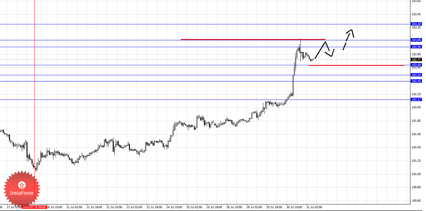 По паре Доллар/Иена ключевыми уровнями в масштабе Н1 являются: 103.30, 103.06, 102.96, 102.69, 102.54, 102.45 и 102.17. Здесь, продолжения движения к верху, ожидаем после прохода ценой шумового коридора 102.95 – 103.06, в данном случае потенциальная цель – 103.30, от этого уровня ожидаем откат к низу. Краткосрочное нисходящее движение, возможно после пробоя 102.69, здесь цель – 102.54, диапазон 102.54 – 102.45 является ключевой поддержкой для восходящей тенденции, его проход ценой будет располагать к развитию нисходящей структуры, в данном случае потенциальная цель – 102.17.