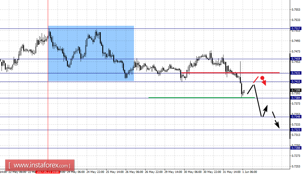 Краткосрочное восходящее движение возможно в коридоре 0.7415 – 0.7431, пробой последнего значения приведет к углубленному движению, здесь цель – 0.7459, этот уровень является ключевой поддержкой для нисходящей структуры.