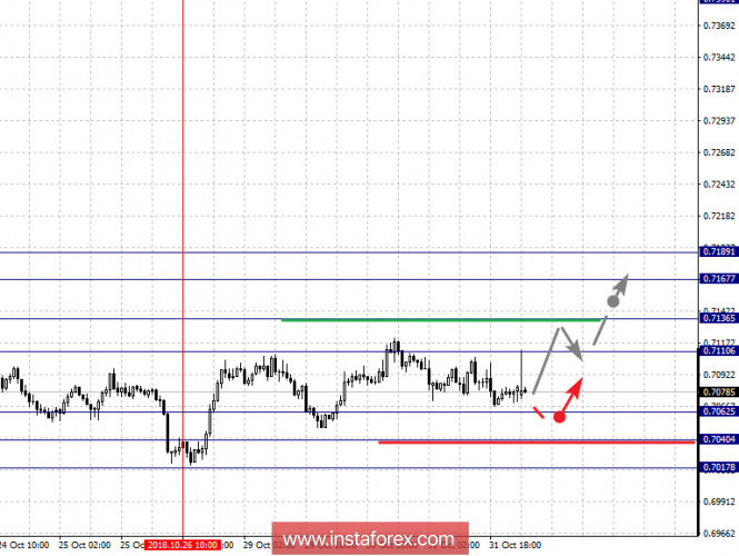 Краткосрочное восходящее движение возможно в коридоре 0.7062 – 0.7040, пробой последнего значения приведет к отмене восходящей структуры от 26 октября, в данном случае первая цель – 0.7017.