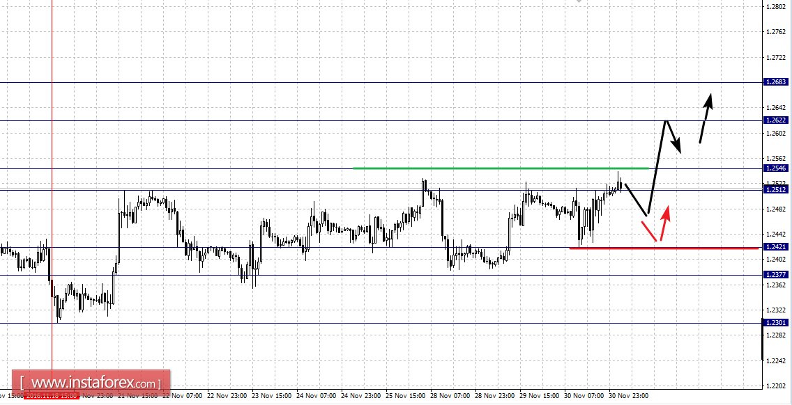 Диапазон 1.2421 – 1.2377 является ключевой поддержкой для восходящей структуры от 18 ноября, его проход ценой будет располагать к развитию нисходящей тенденции, здесь цель – 1.2301.
