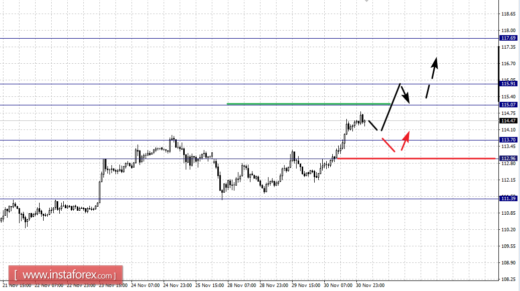 Краткосрочное нисходящее движение возможно в коридоре 113.70 – 112.96, пробой последнего значения будет располагать к формированию потенциала для нисходящего цикла, в данном случае цель – 111.39.