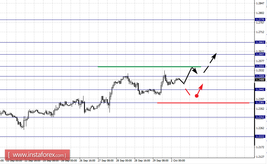 Краткосрочное нисходящее движение возможно в коридоре 1.2442 – 1.2381, пробой последнего значения приведет к углубленной коррекции, здесь цель – 1.2312, этот уровень является ключевой поддержкой для верха, его проход ценой будет располагать к развитию нисходящей структуры, в данном случае цель – 1.2222.
