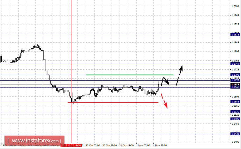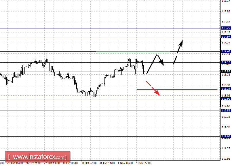 По паре Евро/Доллар диапазон 1.1676 – 1.1701 является ключевой поддержкой для нисходящей структуры. По паре Фунт/Доллар следим за формированием начальных условий для верха от 27 октября. По паре Доллар/Франк возобновления движения кверху ожидаем после пробоя 1.0005. По паре Доллар/Иена продолжения движения кверху ожидаем после пробоя 114.12. По паре Евро/Иена цена формирует небольшой потенциал для верха от 31 октября в корректировочной зоне. По паре Фунт/Иена продолжения движения кверху ожидаем после пробоя 151.40.