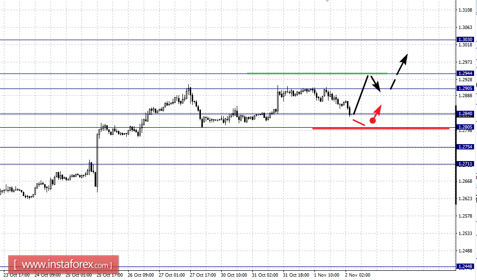 Краткосрочное нисходящее движение возможно в коридоре 1.2840 – 1.2805, пробой последнего значения приведет к углубленному движению, здесь цель – 1.2755, этот уровень является ключевой поддержкой для верха, его пробой будет располагать к формированию начальных условий для нисходящего цикла.