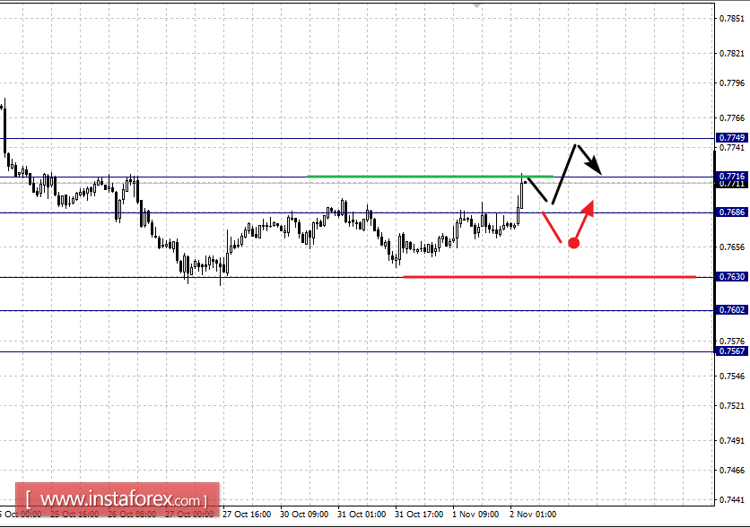 Консолидированное движение возможно в коридоре 0.7686 – 0.7716, пробой последнего значения будет располагать к формированию потенциала для восходящего цикла, в данном случае цель – 0.7749.