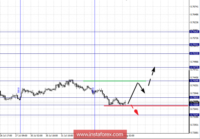 Консолидированное движение возможно в коридоре 0.7381 – 0.7356, пробой последнего значения будет располагать к развитию нисходящей структуры, здесь первая цель – 0.7324.