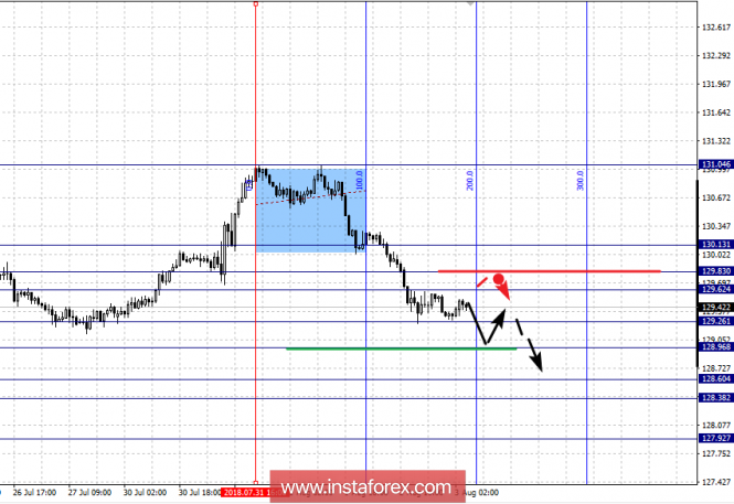 По паре Евро/Иена ключевыми уровнями в масштабе Н1 являются: 130.13, 129.83, 129.62, 129.26, 128.96, 128.60, 128.38 и 127.97. Здесь после отмены восходящей структуры следим за нисходящим циклом от 31 июля. Краткосрочное нисходящее движение возможно в коридоре 129.26 – 128.96, пробой последнего значения приведет к выраженному движению, здесь цель – 128.60, в коридоре 128.60 - 128.38 консолидация. Потенциальным значением для низа считаем уровень 127.92, по достижении которого ожидаем откат кверху.