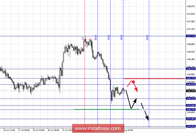 По паре Фунт/Иена ключевыми уровнями в масштабе Н1 являются: 146.07, 145.77, 145.57, 145.12, 144.90, 144.77, 144.48 и 144.24. Здесь цена отменила восходящее движение и на текущий момент мы ожидаем оформления среднесрочной нисходящей структуры от 1 августа. Продолжения движения книзу ожидаем после пробоя 145.12, в данном случае цель – 144.90, проход ценой шумового диапазона 144.90 – 144.77 должен сопровождаться выраженным движением к уровню 144.48. Потенциальным значением для низа считаем уровень 144.24, по достижении которого ожидаем откат кверху.