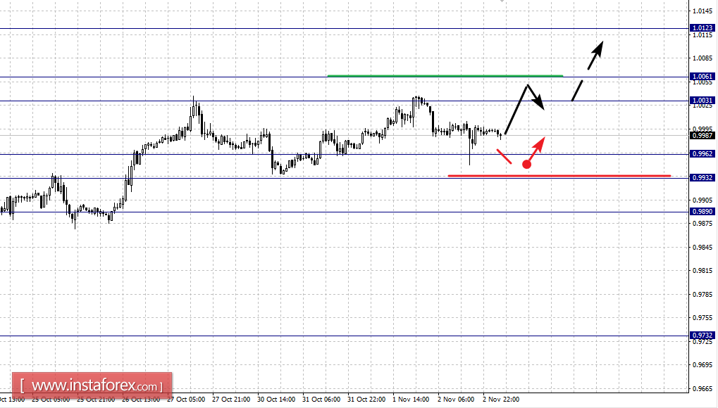 Краткосрочное нисходящее движение возможно в коридоре 0.9962 – 0.9932, пробой последнего значения приведет к углубленной коррекции, здесь цель – 0.9890, этот уровень является ключевой поддержкой для верха.