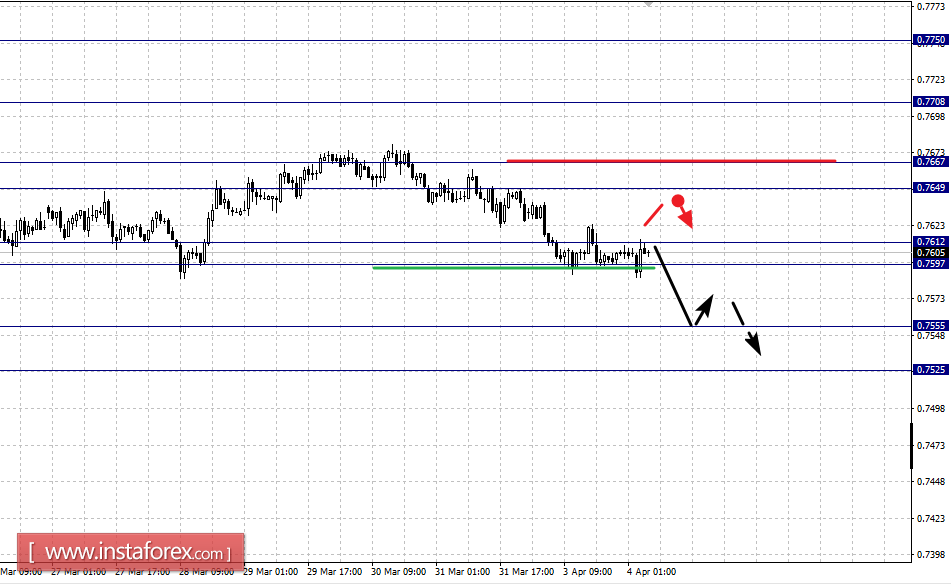 Краткосрочное восходящее движение возможно в коридоре 0.7649 – 0.7667, пробой последнего значения приведет к углубленному движению, здесь цель – 0.7708, этот уровень является ключевой поддержкой для нисходящей структуры от 21 марта.