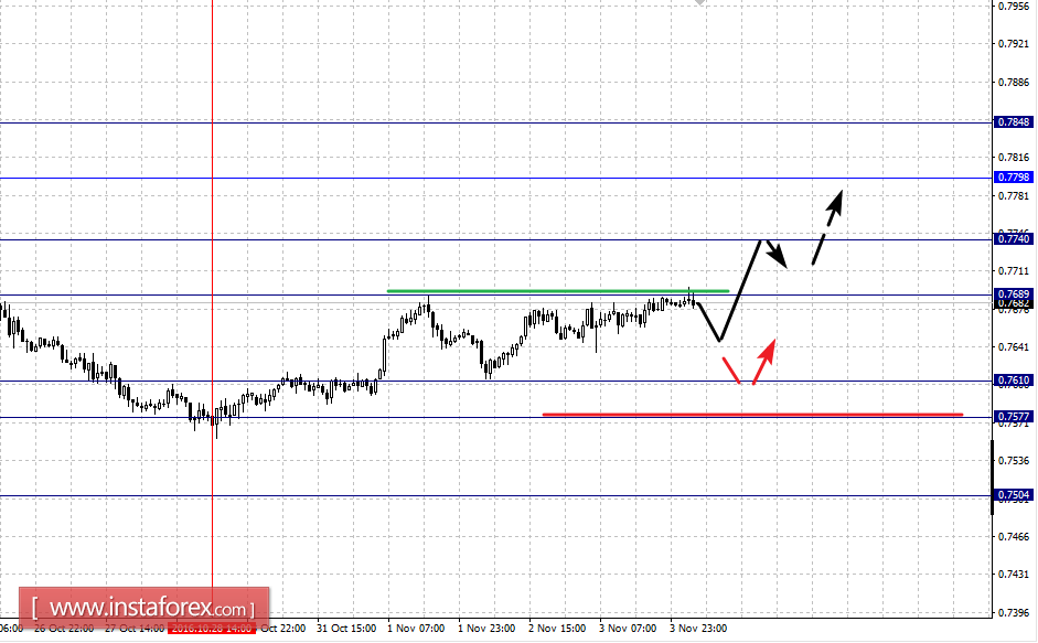 Краткосрочное нисходящее движение, а также консолидация, возможны в коридоре 0.7610 – 0.7577, пробой последнего значения приведет к развитию нисходящего движения, здесь цель – 0.7505.