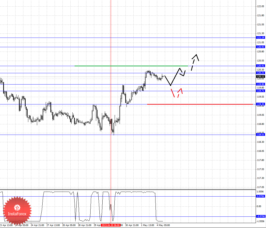По паре Доллар/Иена ключевыми уровнями в масштабе Н1 являются: 121.19, 120.93, 120.41, 120.21, 119.90, 119.71 и 119.35. Здесь мы следим за восходящей структурой от 30 апреля. Краткосрочное восходящее движение ожидаем в коридоре 120.21 – 120.41, пробой последнего значения должен сопровождаться выраженным движением кверху, здесь цель – 120.93. Потенциальным значением для восходящего движения считаем уровень 121.19, по достижении которого ожидаем консолидацию. Краткосрочное нисходящее движение возможно в коридоре 119.90 – 119.71, пробой последнего значения приведет к углубленному движению, здесь цель – 119.35.