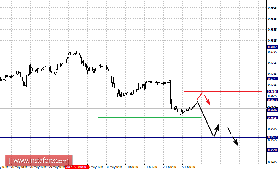 Краткосрочное восходящее движение возможно в коридоре 0.9663 – 0.9686, пробой последнего значения приведет к углубленной коррекции, здесь цель – 0.9721, данный уровень является ключевой поддержкой для нисходящей структуры.