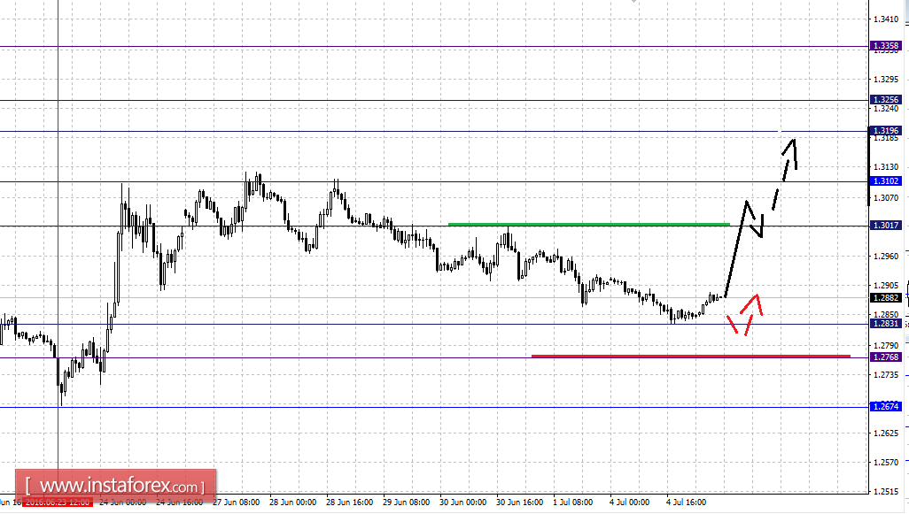 Краткосрочное движение книзу возможно в коридоре 1.2890 – 1.2831, пробой уровня 1.2830 приведет к углубленной коррекции, здесь цель – 1.2770, этот уровень является ключевой поддержкой для верха, его проход ценой будет располагать к развитию нисходящей структуры, в данном случае цель – 1.2674.
