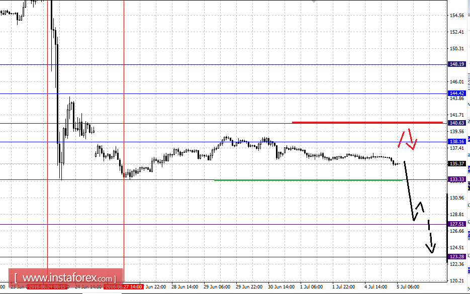 Продолжения движения книзу ожидаем после пробоя 133.33, здесь цель 127.51. В качестве потенциального значения для нисходящего движения рассматриваем уровень 123.28, по достижении которого ожидаем откат кверху. В целом в долгосрочных масштабах потенциал для нисходящей структуры от 24 июня значительно ограничен большей структурой.