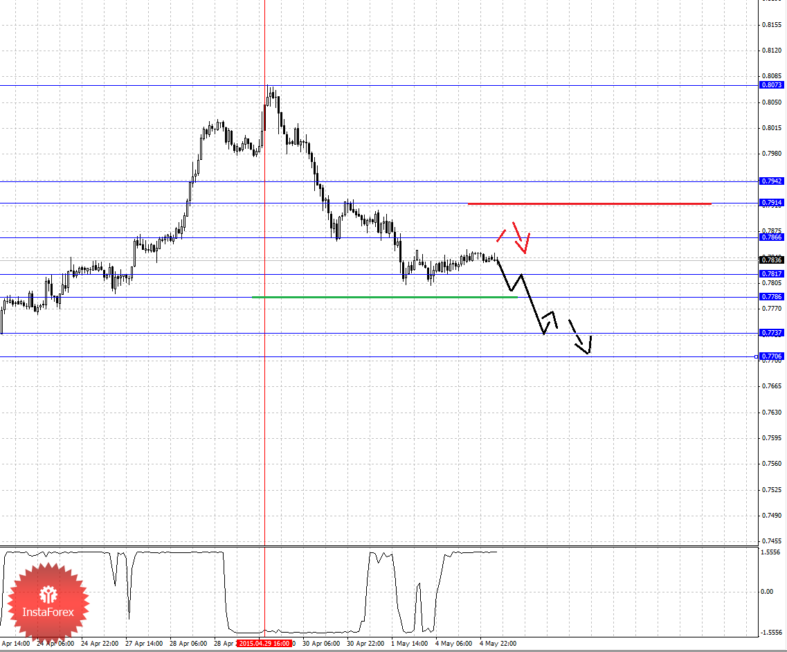 По паре Австралийский доллар/Доллар ключевыми уровнями в масштабе Н1 являются: 0.7942, 0.7914, 0.7866, 0.7817, 0.7786, 0.7737 и 0.7706. Здесь мы следим за формированием среднесрочных начальных условий для нисходящего движения от 29 апреля. Краткосрочное движение книзу ожидаем в коридоре 0.7817 – 0.7786, пробой последнего значения должен сопровождаться выраженным движением к низу, здесь цель – 0.7737. Потенциальным значением для низа считаем уровень 0.7706, по достижении которого, ожидаем консолидацию. Краткосрочное движение кверху возможно после пробоя 0.7866, здесь цель – 0.7914. Уровень 0.7942 является ключевым сопротивлением для восходящего движения, до него ожидаем оформления начальных условий для восходящего цикла.