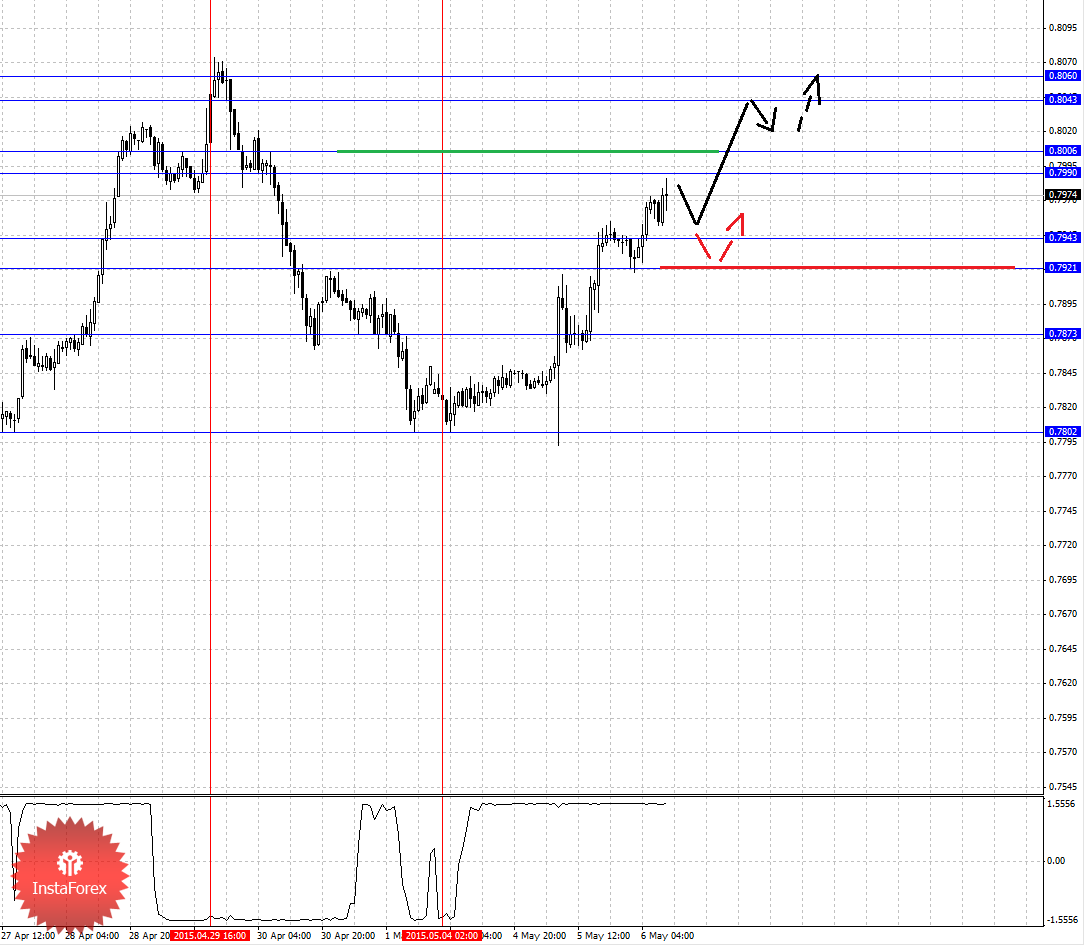 По паре Австралийский доллар/Доллар ключевыми уровнями в масштабе Н1 являются: 0.8060, 0.8043, 0.8006, 0.7990, 0.7943, 0.7921 и 0.7873. Здесь мы следим за развитием восходящей локальной структуры от 4 мая. Продолжения движения кверху ожидаем после прохода ценой шумового диапазона 0.7990 – 0.8006, в данном случае цель – 0.8043, в коридоре 0.8043 – 0.8060 консолидация цены. Краткосрочное нисходящее движение возможно в коридоре 0.7943 – 0.7921, пробой последнего значения приведет к углубленному движению, здесь цель – 0.7873, этот уровень является ключевой поддержкой для верха, его проход ценой будет располагать к развитию нисходящей тенденции.