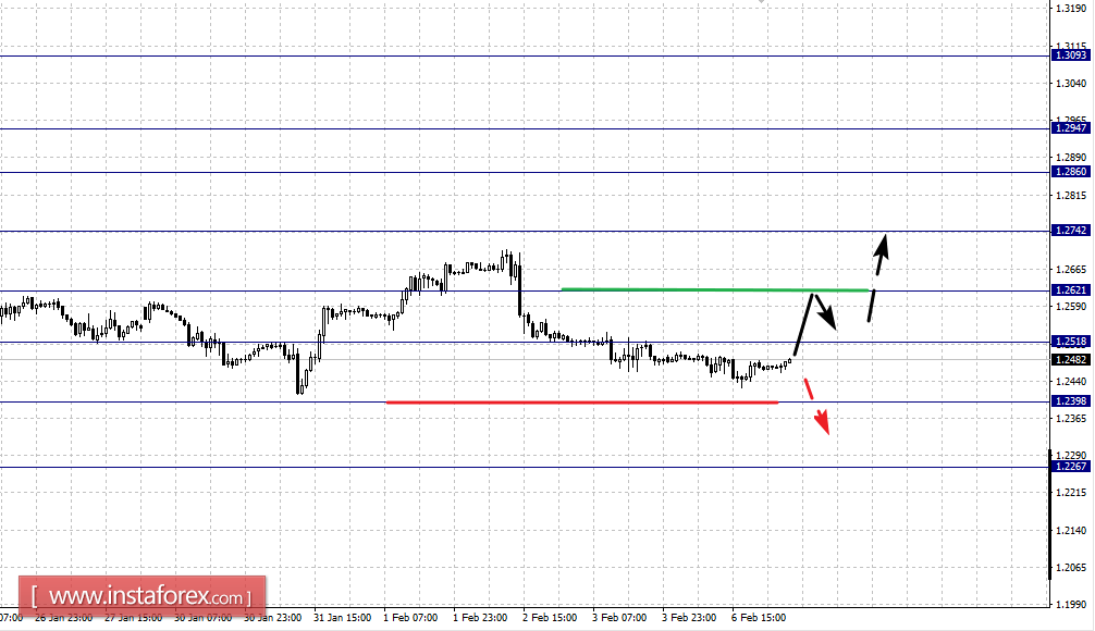 Краткосрочное нисходящее движение, а также консолидация, возможны в коридоре 1.2518 – 1.2398, пробой последнего значения приведет к развитию нисходящей структуры, в данном случае цель – 1.2267.