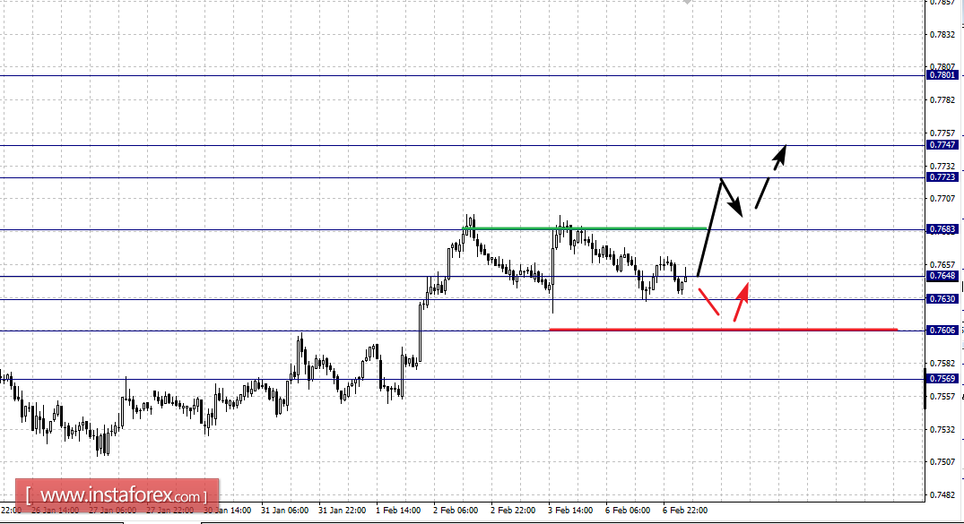 Краткосрочное нисходящее движение возможно в коридоре 0.7648 – 0.7630, пробой последнего значения приведет к углубленной коррекции, здесь цель – 0.7606, этот уровень является ключевой поддержкой для восходящей структуры, его пробой приведет к развитию нисходящей структуры, здесь цель – 0.7570.