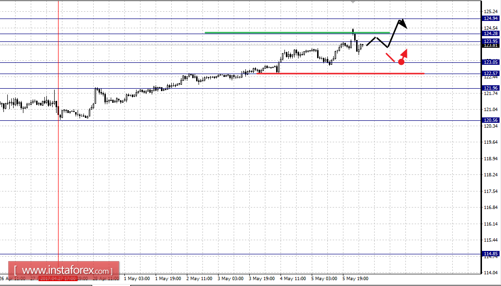 Краткосрочное нисходящее движение возможно в коридоре 123.05 – 122.57, пробой последнего значения приведет к углубленной коррекции, здесь цель – 121.96.