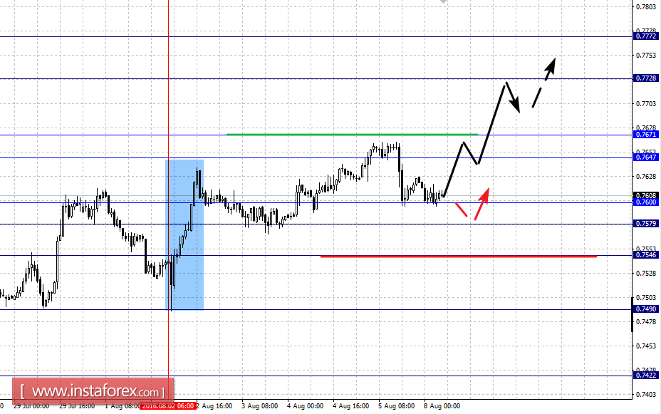 Краткосрочное нисходящее движение возможно в коридоре 0.7600 – 0.7579, пробой последнего значения приведет к углубленной коррекции, здесь цель – 0.7546, этот уровень является ключевой поддержкой для верха, его проход ценой будет располагать к развитию нисходящей структуры, в данном случае цель – 0.7490.
