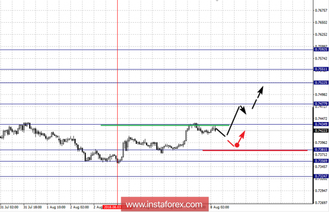 По паре Австралийский доллар/Доллар ключевыми уровнями в масштабе Н1 являются: 0.7592, 0.7551, 0.7522, 0.7477, 0.7434, 0.7410, 0.7381, 0.7356 и 0.7324. Здесь мы следим за формированием восходящей структуры от 3 августа. Продолжения движения кверху ожидаем после пробоя 0.7434, в данном случае первая цель - 0.7477, возле этого уровня консолидация. Пробой 0.7477 позволит рассчитывать на движение к 0.7522, в коридоре 0.7522 – 0.7551 краткосрочное восходящее движение, а также консолидация. Потенциальным значением для верха считаем уровень 0.7592, по достижении этого уровня ожидаем откат книзу.