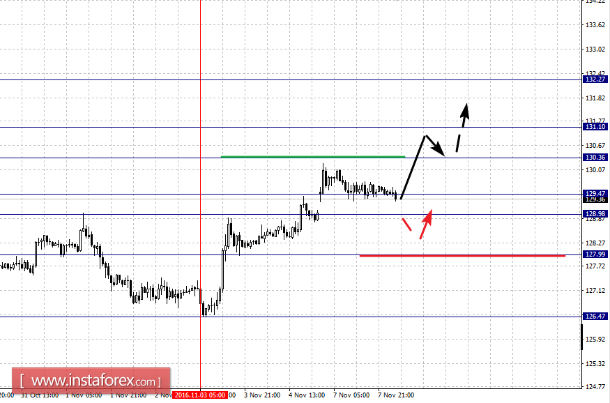 По паре Фунт/Иена ключевыми уровнями в масштабе Н1 являются: 132.27, 131.10, 130.36, 129.47, 128.98 и 127.99. Здесь мы продолжаем следить за локальной восходящей структурой от 3 ноября. Продолжения движения кверху ожидаем после пробоя 130.36, в данном случае цель – 131.10, возле этого уровня консолидация. Потенциальным значением для верха считаем уровень 132.27, движение к которому ожидаем после пробоя 131.10.