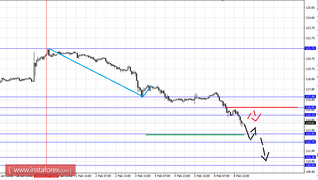Краткосрочное восходящее движение возможно в коридоре 115.33 – 116.05, пробой последнего значения приведет к развитию углубленной коррекции, здесь цель – 117.05.