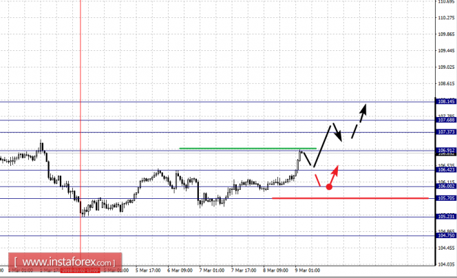 Уход в коррекцию ожидаем после пробоя 106.42, в данном случае цель – 106.00, диапазон 106.00 – 105.70 является ключевой поддержкой для восходящей структуры, его проход ценой будет располагать к развитию нисходящего движения, в данном случае первая цель – 105.23.