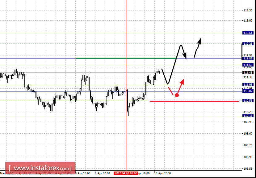 Краткосрочное нисходящее движение возможно в коридоре 111.06 – 110.87, пробой последнего значения приведет к углубленной коррекции, здесь цель – 110.58, этот уровень является ключевой поддержкой для восходящей структуры от 7 апреля.