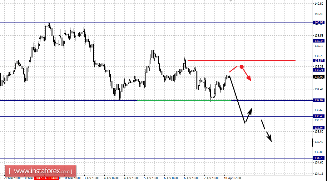 Краткосрочное восходящее движение возможно в коридоре 138.21 – 138.57, пробой последнего значения приведет к развитию углубленной коррекции, здесь цель – 139.34, этот уровень является ключевой поддержкой для низа от 31 марта.