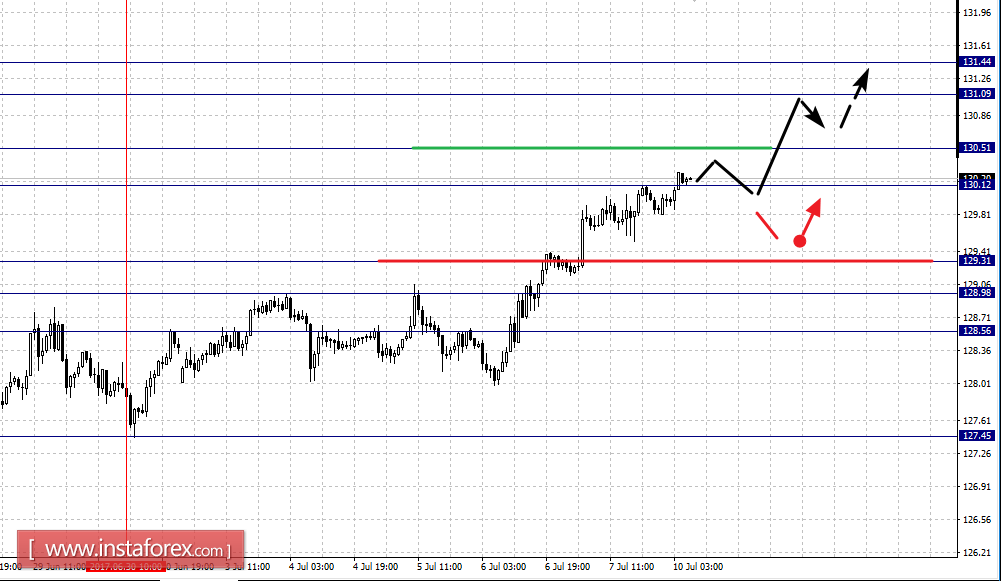 Краткосрочное нисходящее движение возможно в коридоре 129.31 – 128.98, пробой последнего значения приведет к углубленной коррекции, здесь цель – 128.56, этот уровень является ключевой поддержкой для верха.