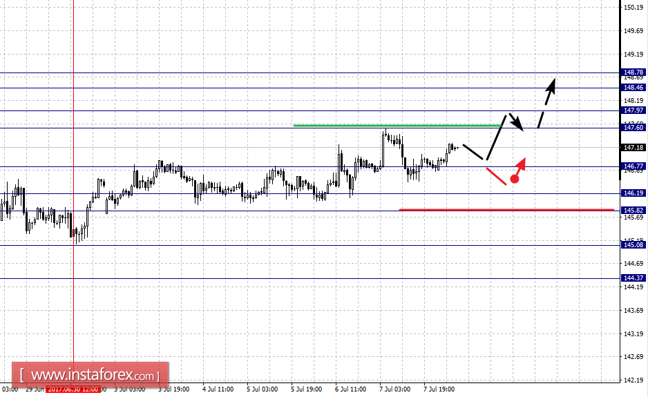 Краткосрочное нисходящее движение возможно после пробоя 146.77, здесь цель – 146.19, диапазон 146.19 – 145.82 является ключевой поддержкой для восходящей структуры от 30 июня, его проход ценой будет располагать к развитию нисходящей структуры, в данном случае потенциальная цель – 145.10.