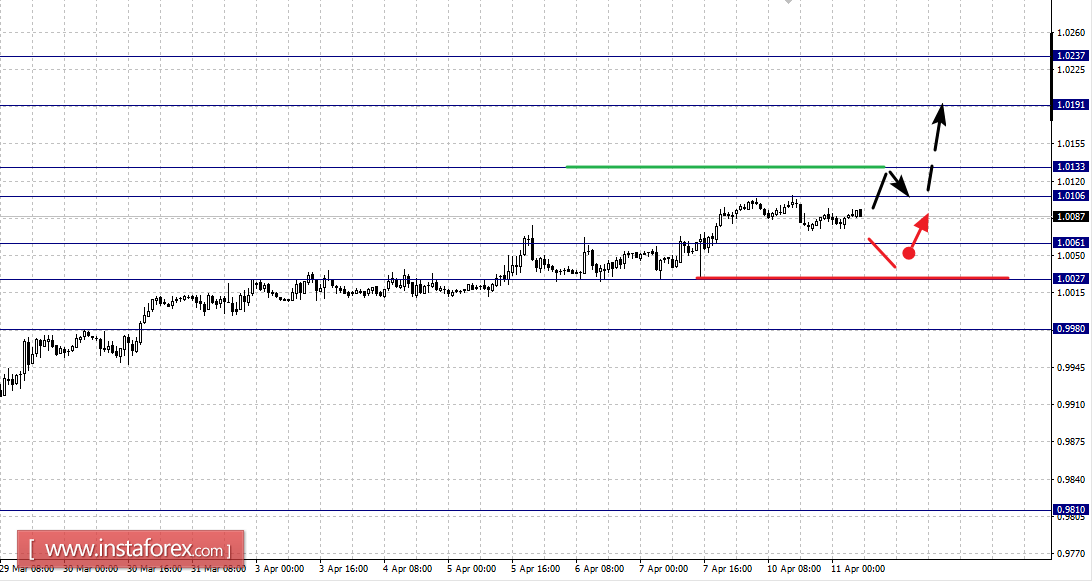 Краткосрочное нисходящее движение возможно в коридоре 1.0061 – 1.0027, пробой последнего значения приведет к углубленному движению, здесь цель – 0.9980, этот уровень является ключевой поддержкой для верха.