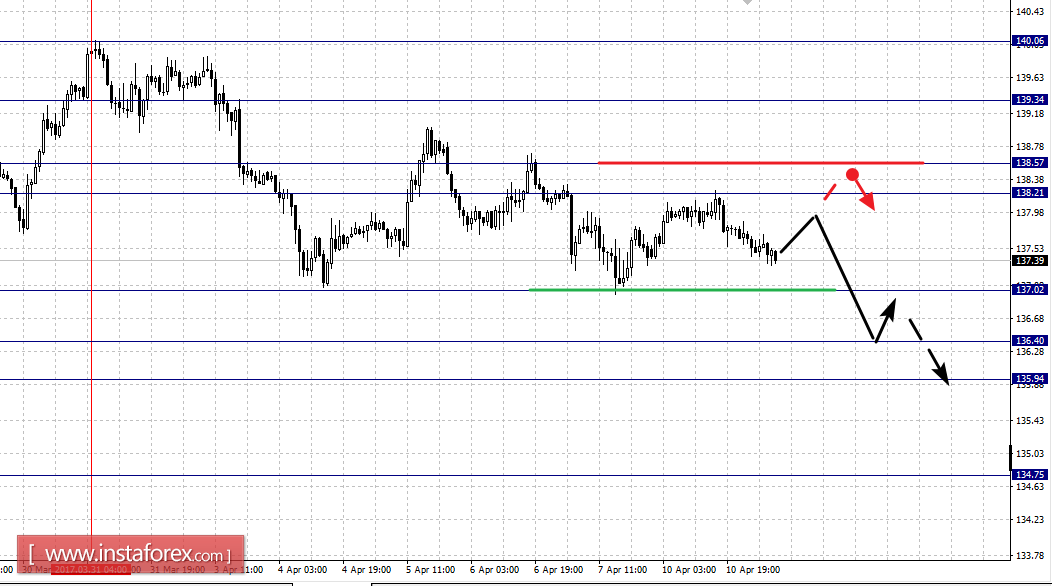 Краткосрочное восходящее движение возможно в коридоре 138.21 – 138.57, пробой последнего значения приведет к развитию углубленной коррекции, здесь цель – 139.34, этот уровень является ключевой поддержкой для низа от 31 марта.