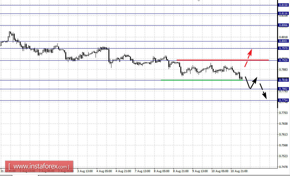Уход в коррекцию возможен после пробоя 0.7920, здесь цель – 0.7970, диапазон 0.7970 – 0.8001 является ключевой поддержкой для нисходящей структуры, его проход ценой будет располагать к развитию восходящей структуры, в данном случае цель – 0.8066.