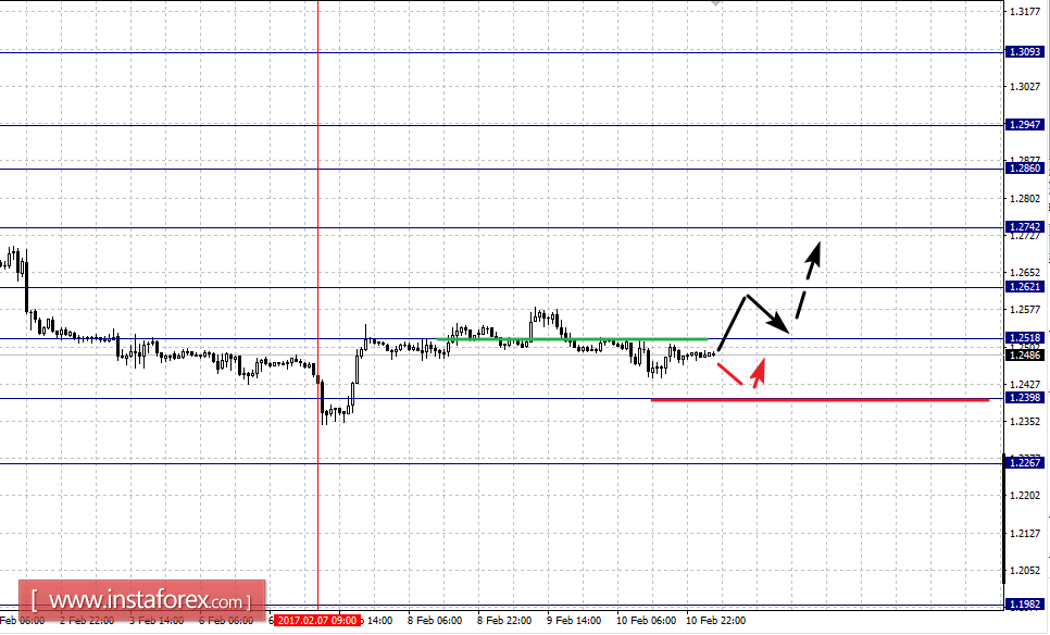 Краткосрочное нисходящее движение, а также консолидация, возможны в коридоре 1.2518 – 1.2398, пробой последнего значения приведет к развитию нисходящей структуры, в данном случае цель – 1.2267.